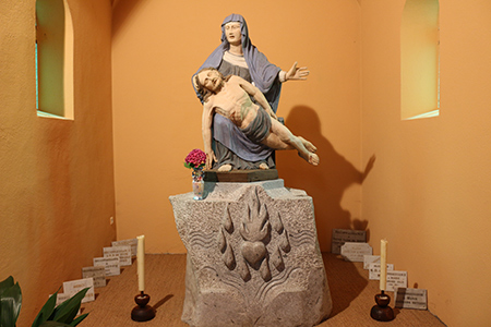 Sobre su base de granito gris, extraído del río de La Souche, con una altura de aproximadamente 95 cm y un peso de casi 2 toneladas, la Pietà recupera su belleza original, imbuida de una dolorosa gravedad. La sobriedad del lugar, te permite centrar la mirada en el objeto de tu búsqueda: Jesús, bajado de la Cruz y puesto nuevamente en los brazos de su Madre, la Madre de los Dolores que presenta a nosotros su hijo. Hijo del Padre, murió para darnos vida.